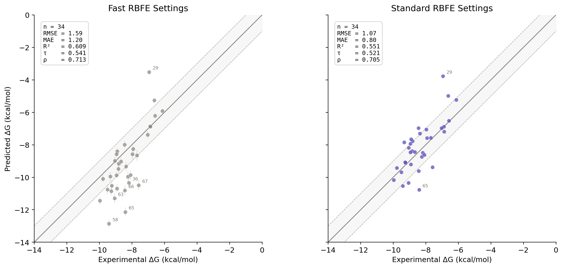 The accuracy of the "fast" FEP run is noticeably worse: cycle-closure errors are higher (from 0.95 kcal/mol to 2.15 kcal/mol), per-leg uncertainties increase, and the overall MAE & RMSE are worse. Fortunately, though, the overall ranking of compounds versus experiment is roughly the same, as assessed by Kendall's Ï and Spearman Ï analysis. Visual inspection shows that the "fast" settings exaggerate the slope of the series, under-predicting the affinity of weak binders and over-predicting the affinity of strong binders.